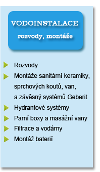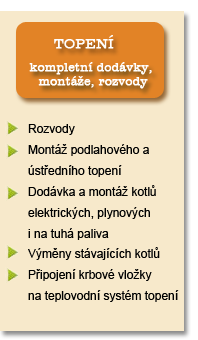 Provádím práce plynařské do 50kw, topenářské a vodoinstalatérské. Zajistím dodávky zboží, rozvody, montáže zařízení jak v novostavbách, tak i při rekonstrukci. Spolupracuji s českými i zahraničními dodavateli produktů.
